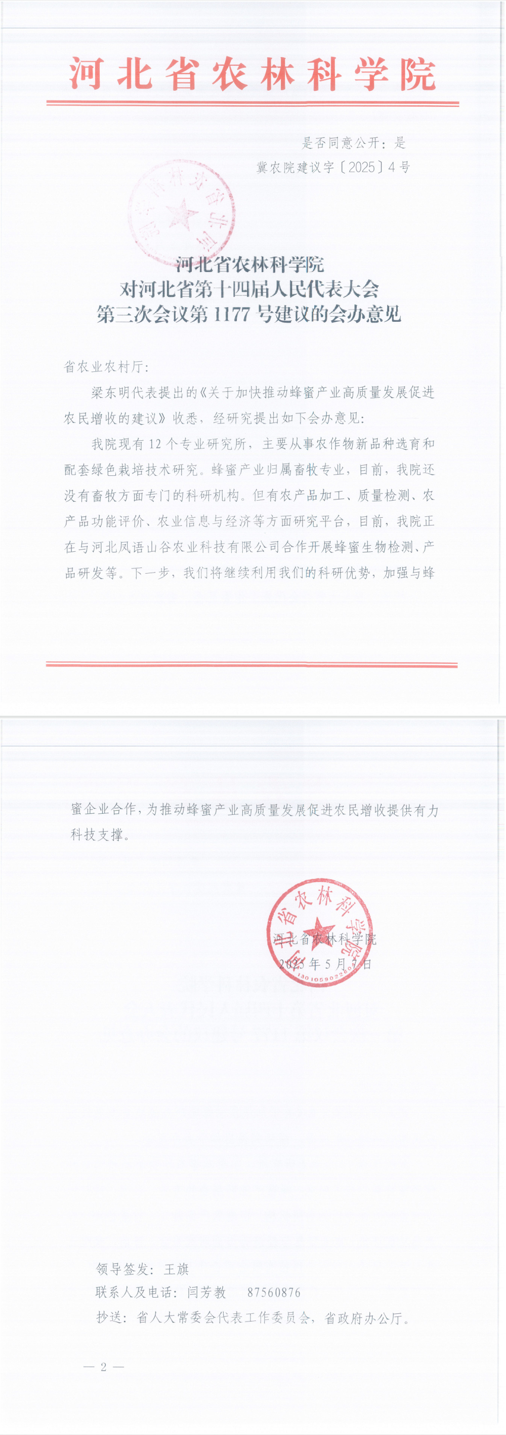 冀农院建议字〔2025〕4号对河北省第十四届人民代表大会第三次会议第1177号建议的会办意见(关于加快推动蜂蜜产业高质量发展促进农民增收的建议)