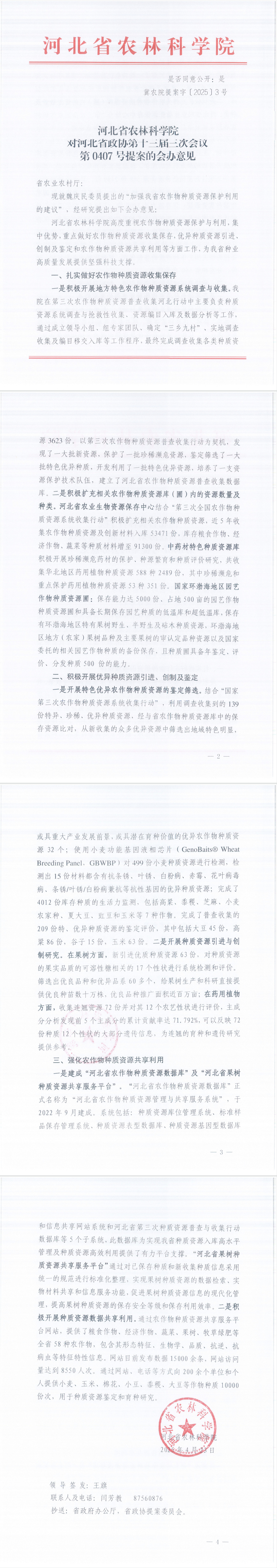 冀农院提案字〔2025〕3号—第0407号提案的会办意见(加强我省农作物种质资源保护利用的建议)