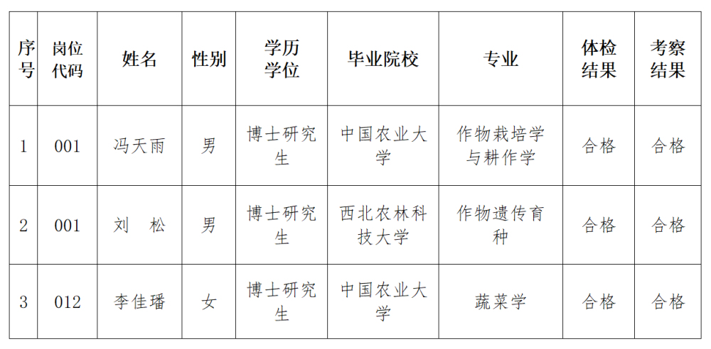 根据《河北省事业单位公开招聘工作人员暂行办法》和《河北省农林科学院直属事业单位2025年选聘工作人员公告》,经报名资格审查、面试、体检、考察等程序,确定以下3人为拟聘人员,现予以公示: