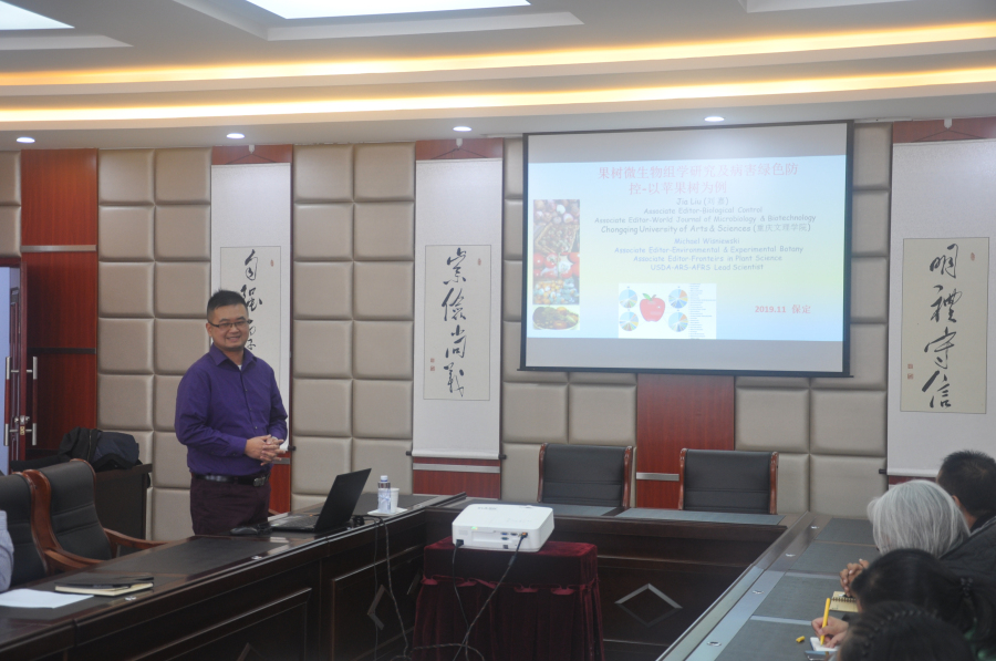2019年11月6日,我院植保所邀请重庆文理学院园林与生命科学学院院长刘嘉教授来所开展学术交流,做了题为“果树微生物组学研究及病害绿色防控”的学术报告,介绍了利用微生物组学技术分析苹果内生菌的多样性,以及如何根据微生物组学技术分离农业有益微生物的思路和方法。