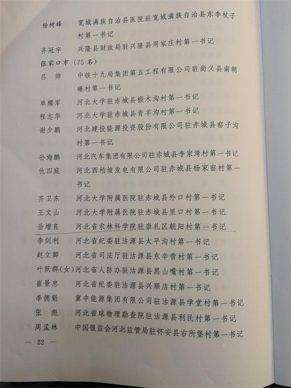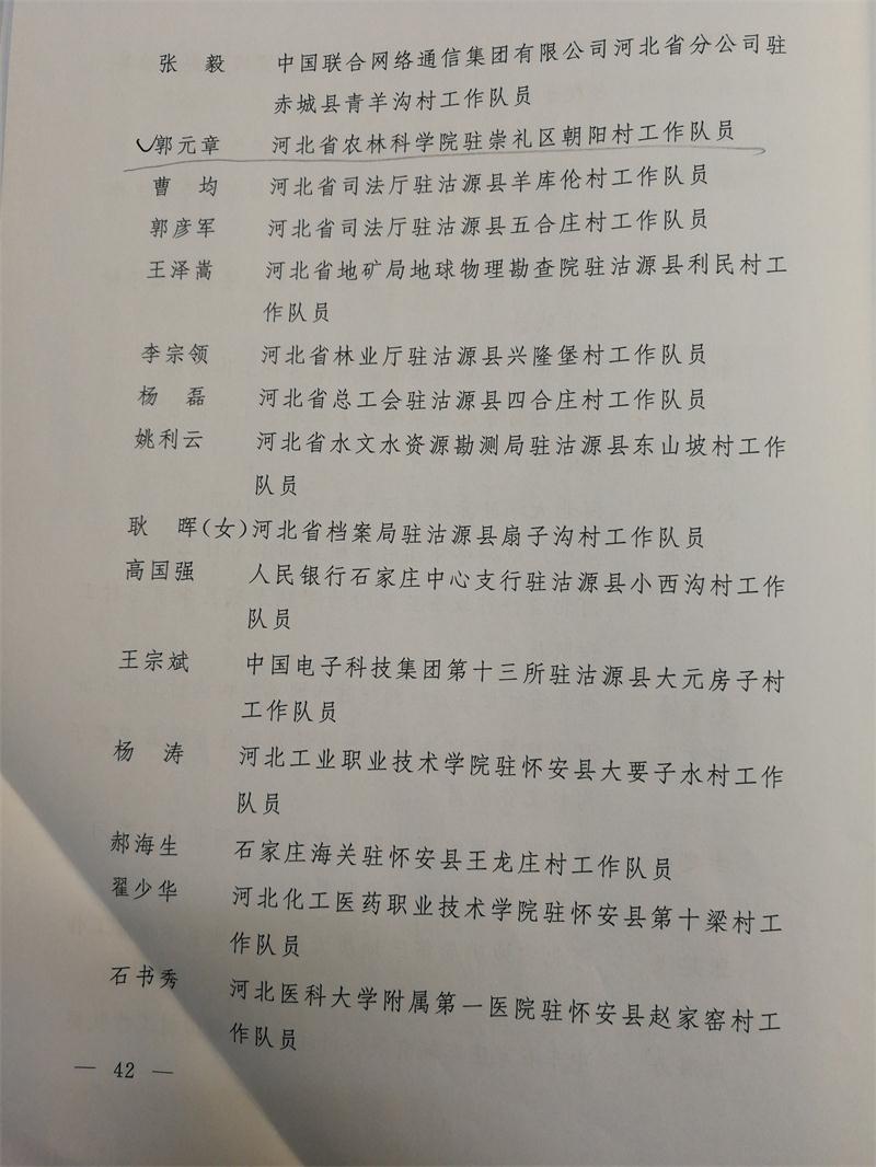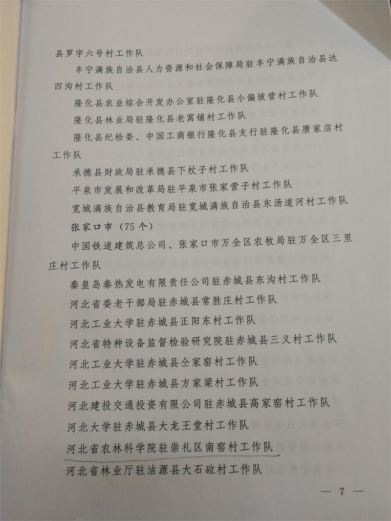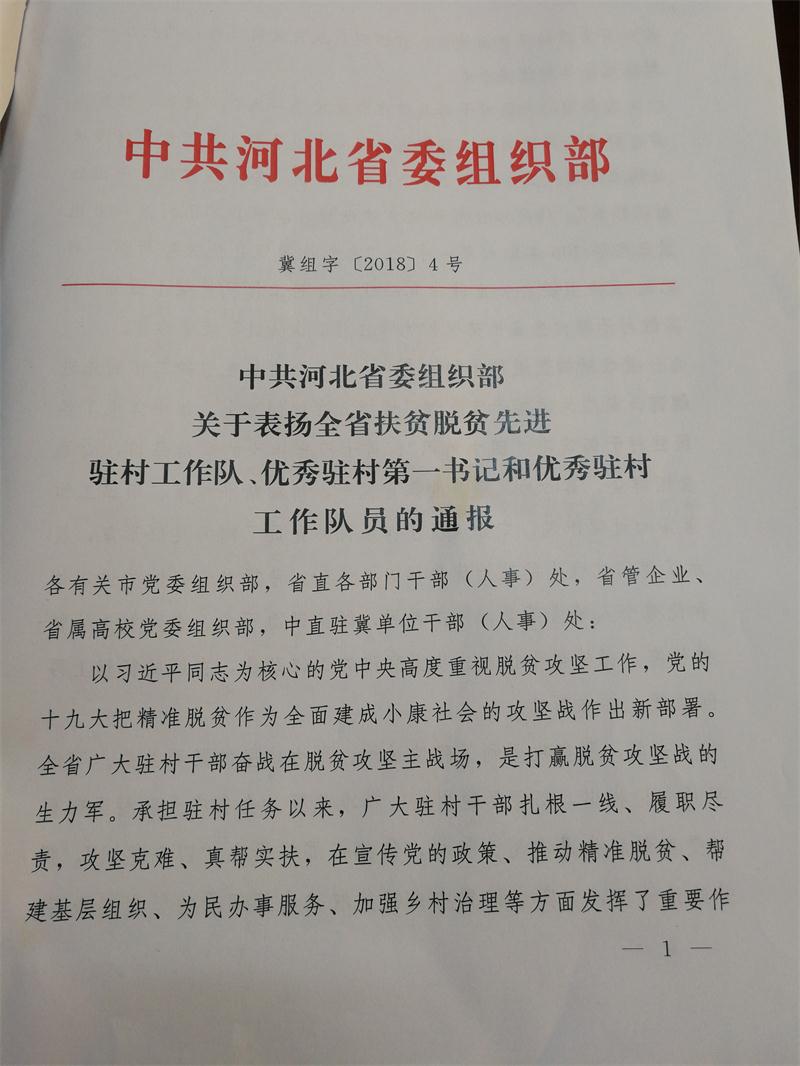 近日,河北省委组织部通报表彰了一批全省扶贫脱贫先进驻村工作队、优秀驻村第一书记和优秀驻村工作队员。我院驻崇礼区南窑村工作队被评为“先进驻村工作队”,岳增良同志被评为“优秀驻村第一书记”,郭元章同志被评为“优秀驻村工作队员”。