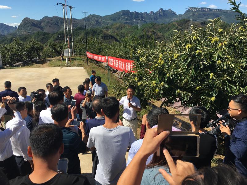 会议考察了以昌果所为科技支撑的承德神栗食品有限公司板栗基地及碾子峪镇艾峪口万亩板栗基地,王广鹏研究员就在该地开展的科技服务工作进行了现场介绍,引领大家实地观摩了昌果所自育板栗新品种和自研板栗“轮替更新”管理技术的大面积规模化示范应用给当地带来的农民增收、企业增益、产业增值良好效果。河北省电视台、承德市电视台、宽城县电视台全程做了采访。