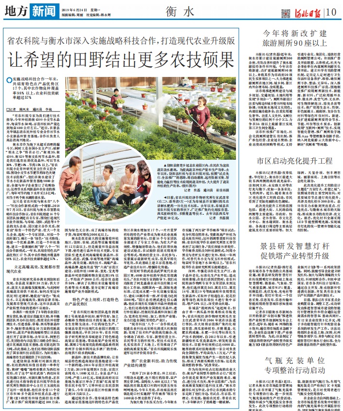 2019年6月24日,《河北日报》第10版对我院与衡水市战略科技合作做专题报道。此次报道,旨在全面、生动的反映实施战略科技合作一年来取得的成效,向社会各界展示农业科技贡献的成果。