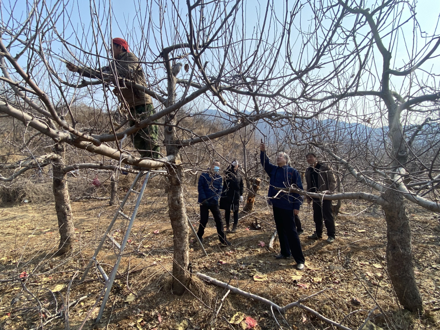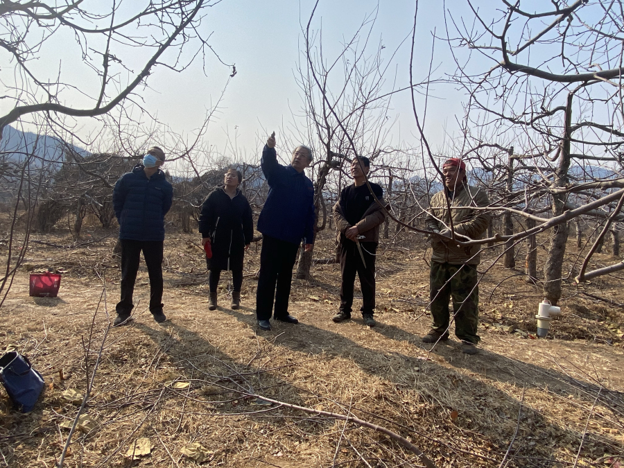2023年2月22日,石家庄果树研究所苹果栽培团队杜纪壮研究员带队到平山县元坊村进行该村苹果产业发展规划及苹果老果园高光效树形改造技术指导。 专家团队针对元坊村南岭不同树龄,结合不同片区树体生长情况,提出了逐年提高树干高度,整体控制树体总高度,如何合理调整培养骨干枝,以及结合修剪重点进行苹果大树腐烂病防治,修剪后尽快落实清园及施肥、灌水等配套管理技术方案,并进行了现场示范。