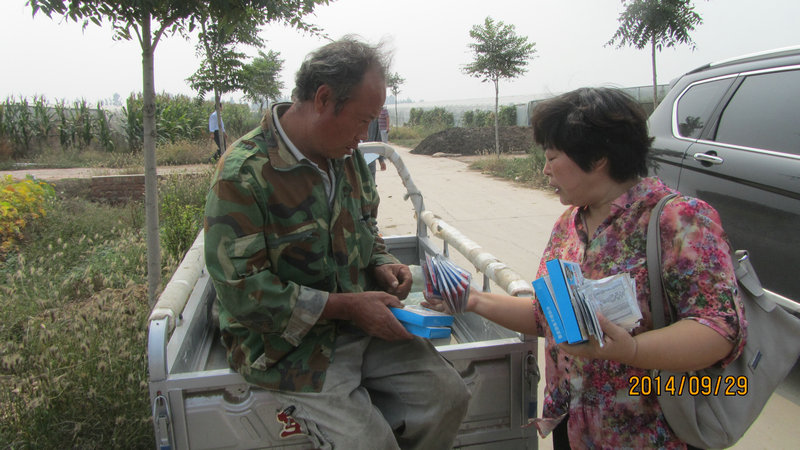 图7:9月29日在青县齐营村张小风、韩秀英研究员,向菜农赠送杀虫剂和杀菌剂