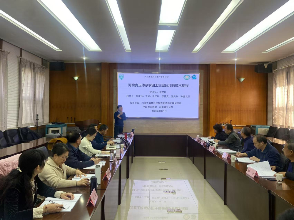 2025年3月29日,受河北省市场监督管理局委托,河北省农业农村厅邀请中国科学院遗传与发育生物学研究所农业资源研究中心、中国农业科学院农业资源与农业区划所、中国农业大学、河北省耕地质量监测保护中心等的有关专家组成标准审定委员会,对河北省农林科学院农业资源环境研究所、中国农业大学、河北农业大学联合起草的《河北麦玉体系农田土壤健康培育技术规程(送审稿)》(ny2024054)进行了审定。省市场监管局和省农业农村厅相关负责同志、及标准起草单位负责人省农科院资环所候升林所长和标准起草组成员20余人参加了审定会。 标准起草组对标准的编制情况和主要技术内容进行了详细的汇报,经审定委员会对标准逐章逐条进行了认真的审查和修改,质疑答辩,一致通过该标准的审定,认为该标准编制依据充分,技术成熟先进,各项条款科学合理,其编制和技术水平居国内领先。该标准为河北省首项关于土壤健康的地方标准,其发布、实施将对将规范将进一步规范小麦-玉米两熟区农田土壤健康培育技术,提升耕地健康水平,为促进农业高质量发展提供技术支撑,为土壤健康评价和健康土壤培育在全国范围实施提供“河北方案”具有重要意义。