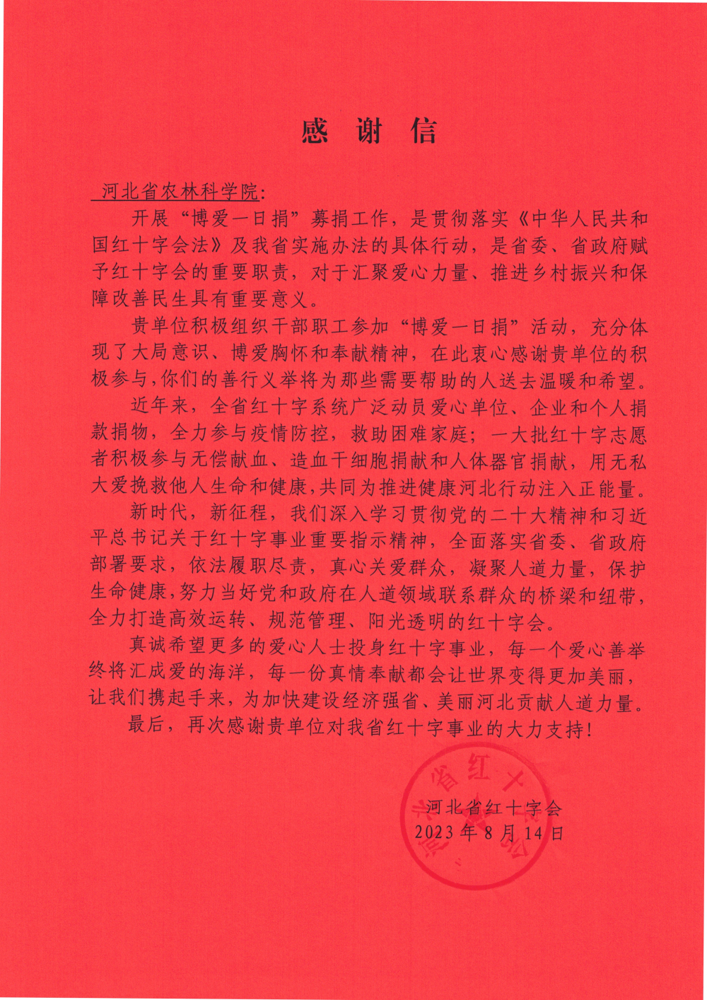 人人参与公益、人人奉献爱心。此次活动中,省农林科学院高度重视,安排专人负责,及时与省红十字会联系对接;在全院大力宣传开展“博爱一日捐”活动的重要意义,动员广大干部职工积极参与,一起做好事、献爱心、帮他人。院、所各级领导干部率先垂范,带头捐款,广大干部职工踊跃参与,大力弘扬“人道、博爱、奉献”的红十字精神,立足本职,服务群众,用实际行动践行社会责任,为奋力谱写中国式现代化建设河北篇章贡献农科人道力量。