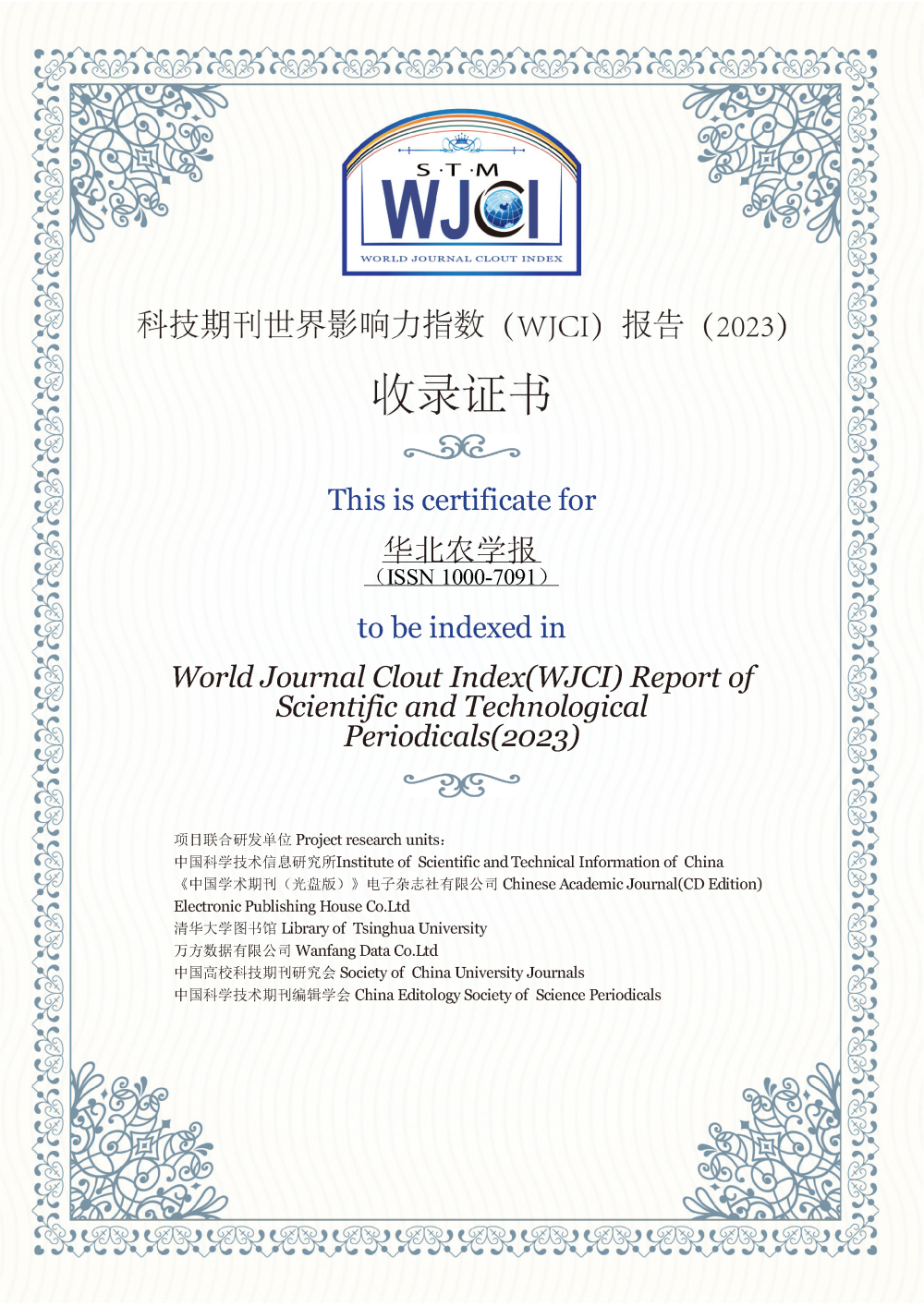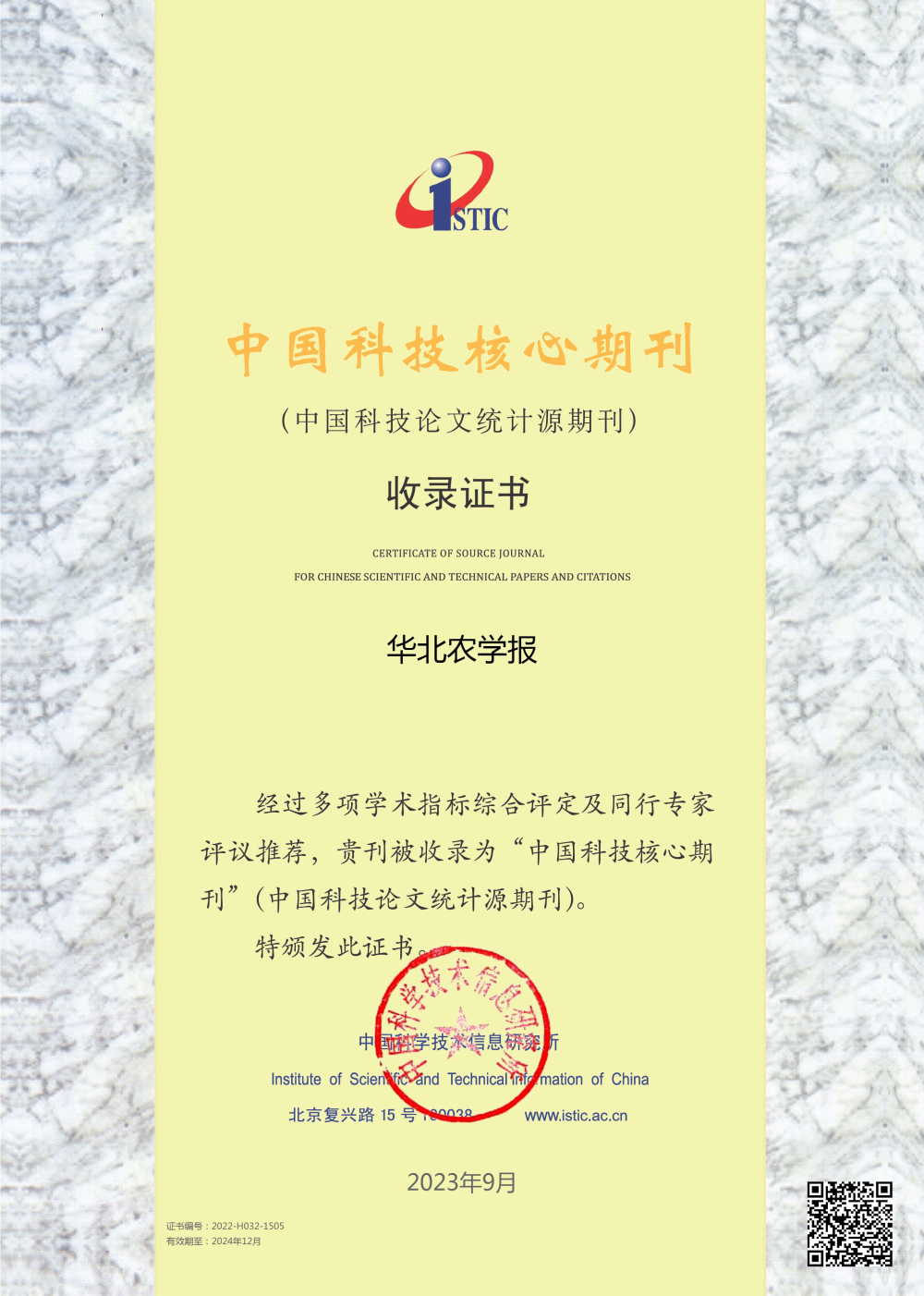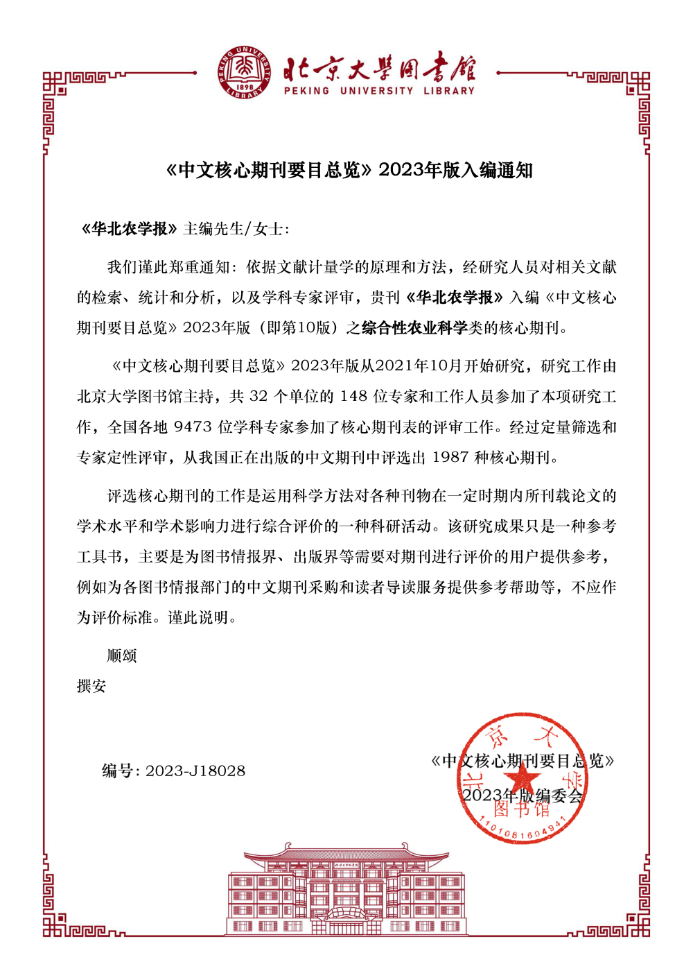 近期,《中文核心期刊要目总览》2023年版(即第10版)正式发布,我院主管、主办的《华北农学报》再次入选《中文核心期刊要目总览》综合性农业科学类核心期刊。《中文核心期刊要目总览》历经1992、1996、2000、2004、2008、2011、2014、2017、2020、2023年版共10版,这是学报自1992年首次入选以来第十次入选北大中文核心期刊。2023年版《中文核心期刊要目总览》由北京大学图书馆主持,全国9473 位学科专家参加了核心期刊表的评审工作,依据文献计量学的原理和方法,经过定量筛选和专家定性评审,评选出 1987 种核心期刊。