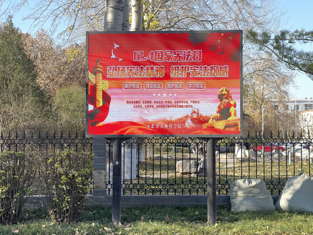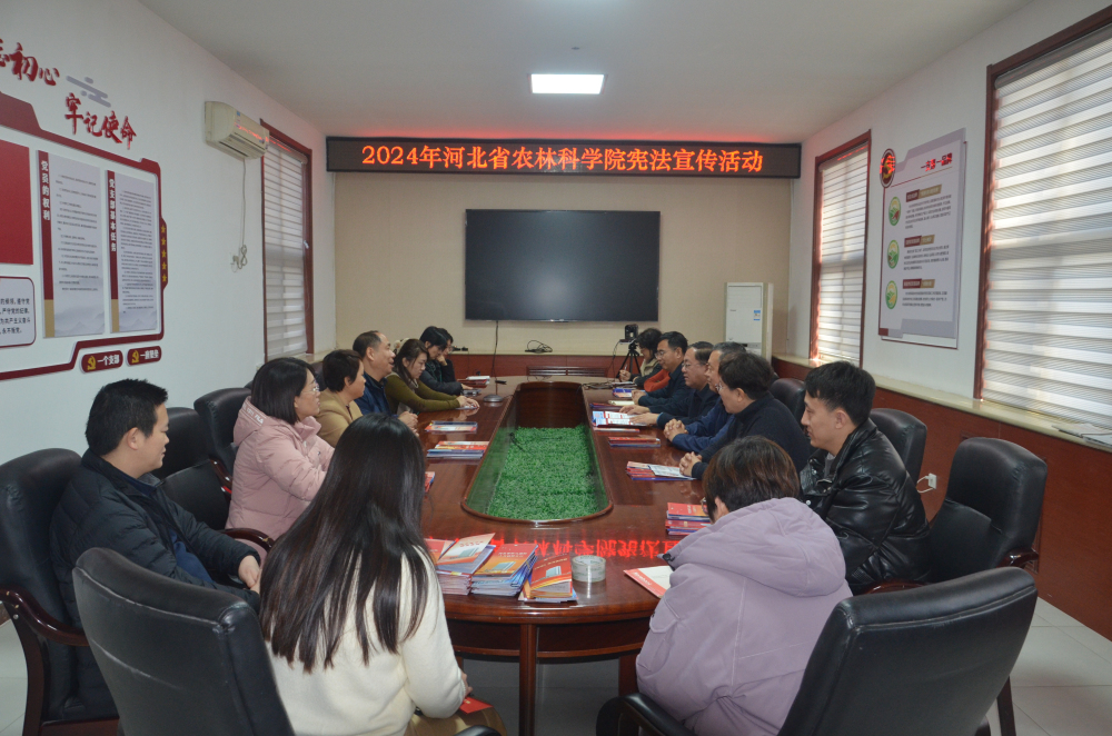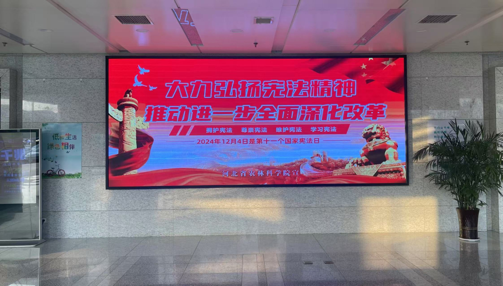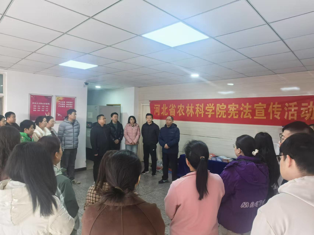 为大力加强宪法宣传,利用院机关和生活区电子屏滚动播放宣传宪法法律知识,并利用院机关微信和qq工作群等互联网新媒体平台,向全院干部职工发送宪法法律知识信息。各研究所结合自身专业特点,利用网站、电子屏、宣传海报广泛宣传宪法法律知识,积极运用研究所微信工作群,以管理部门、研究室或课题组为单元,向党员干部和广大科技人员推送宪法法律知识。为丰富宪法宣传载体,机关纪委印制了《宪法》《河北省平安建设条例》《河北省消防条例》《河北省防汛避险人员转移条例》《预防电信诈骗》和《预防校园欺凌》宣传册,并在12月3日,组织普法人员在资源环境研究所、生物与食品研究所实验室和经济作物研究所试验站向科研一线科技人员发放宣传手册,认真讲解宪法相关法律知识以及如何主动防范风险,排查消防隐患,做好平安建设,预防校园欺凌和电信诈骗等知识,积极营造宪法学习宣传氛围,有力推动了宪法宣传进科研一线、进机关、进基层、进网络,真正把宪法精神、法治元素融入农业科研全过程、各方面。