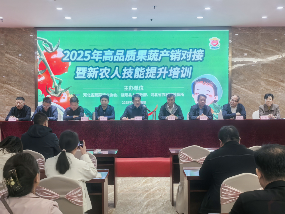 4月15日,我院植保所联合省蔬菜行业协会、饶阳县人民政府、省蔬菜创新产业体系,在衡水市饶阳县成功举办2025年高品质果蔬产销对接暨新农人技能提升培训活动。本次活动旨在通过产销对接与技能培训双规推进,促进饶阳果蔬产业转型升级,助力京津冀农产品供应链提质增效。应饶阳县人民政府邀请,院党组成员、副院长王旗出席活动。我院旱作所、经作所、石果所等单位有关负责同志、专家团队,衡水市农业农村局相关负责同志及产销主体代表等200余人参加。