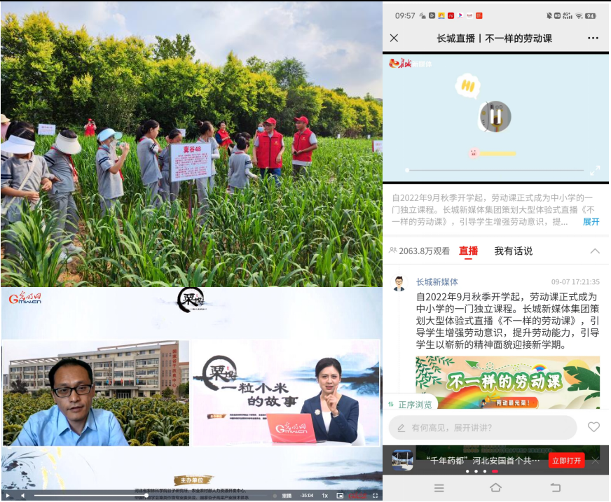 谷子所是中国科协认定的“十四五”首批全国科普教育基地,基地拥有3000平米分子生物学实验室、5亩五谷杂粮科普展示田、320亩试验站、1000平米武安磁山粟文化馆等科普资源。2022年谷子所依托该教育基地,分别与太行大街小学、河北科技大学食品与生物学院签订了共建科普教育基地的协议。全年开展科普教育、科普培训、科技服务等活动20余次,受众2400万人以上,其中与长城新媒体联合拍摄的“不一样的劳动课”科普教育直播受众2063.4万人,《粟说一粒小米的故事》光明网科普直播解读受众425.2万人。