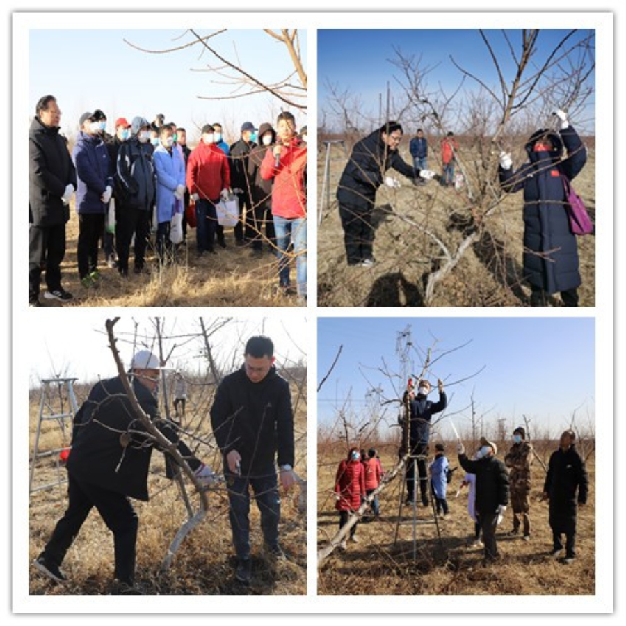 沐浴着早春的阳光,呼吸着新鲜的空气,大家来到活动基地——灵寿县仙桃谷,开展一场与大自然亲近、与果树对话的联学共建实践活动。本着“老带新 传帮带”的原则,采取两人一组的方式进行果树修剪,同时专家组成员进行现场巡视,随时解答,指导修剪人员的技术问题。活动现场,有的人在剪、有的人在锯、有的人指挥、有的人在树下收拾残枝,灵寿仙桃谷桃树地里呈现出一片繁忙景象。在去程路上,进行了关于果树修剪、党的二十大精神等方面知识问答互动。