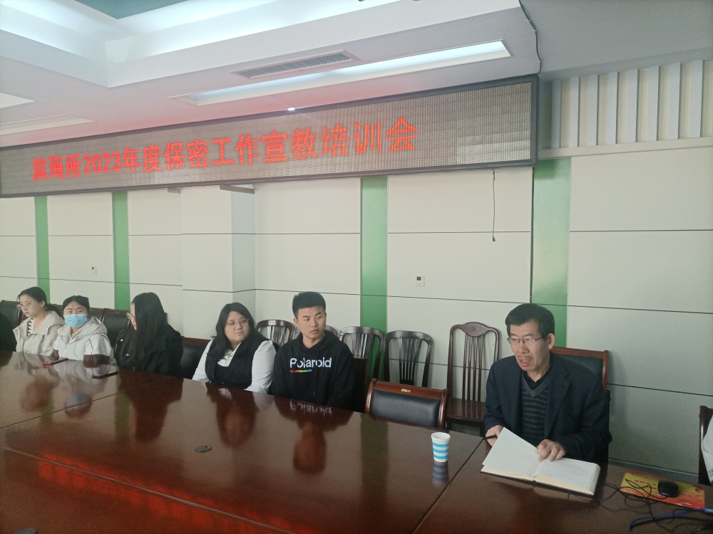2023年4月13日,滨海所召开2023年度保密工作宣教培训会议。会议由滨海所副所长兼保密委副主任吴新海同志主持,所保密委成员、各科室主任及相关工作人员参加。