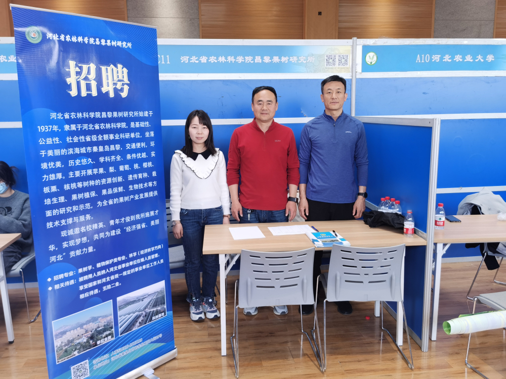 为全面贯彻习近平新时代中国特色社会主义思想主题教育实施方案,加强与重点农业高校、名导名师团队联系,加大优秀博士和“双一流”高校硕士的选聘力度,同时破解研究所紧缺皇冠现金官网hga2020的人才招聘困难问题,4月26日,河北省农林科学院昌黎果树研究所现场继2月28日赴西北农林科技大学举办“园艺学院科研院所类专场招聘会”后,再次参加了在中国农业大学东校区(北京) 招聘活动厅举办的“第八届全国农业高校、科研院所高层次人才引进洽谈会”,昌黎果树研究所副所长曾庆明带队,人事科、科技人员代表参加此次招聘会。