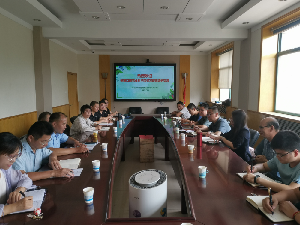7月24日下午,张家口市农业科学院总农艺师王晓明研究员一行来我院信息与经济所调研交流,院综合部负责同志陪同调研,信息与经济所党总支书记黄铁抓、副所长范凤翠等相关科研人员20余人参加交流。