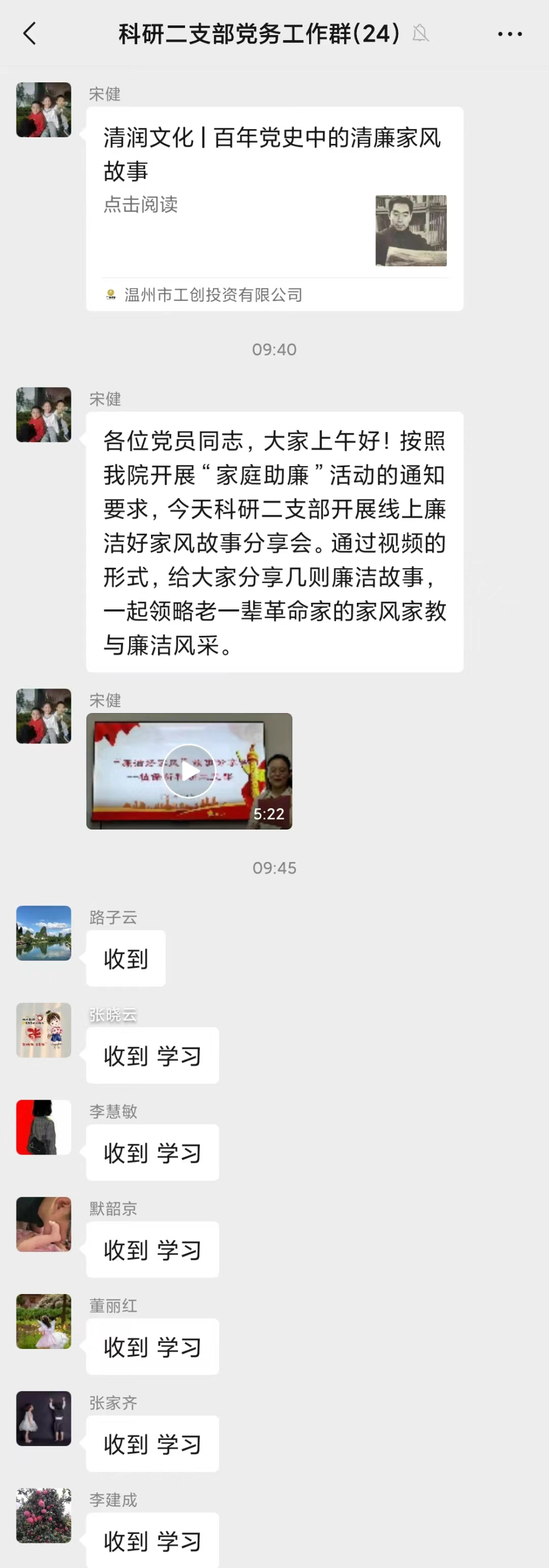 科研一支部分享会由支部书记赵建江主持,赵建江领学了李保国同志的廉洁家风故事,支部党员张俊同志深情讲述了自己外公的故事。他的外公是一名抗美援朝老共产党员,曾在战场上坚守廉洁信念,回乡后成为松滋最早的一批共产党员,尽管一生清贫,但从不向组织提出个人要求,始终保持廉洁本色。王亚娇同志分享了廉洁家风在孩子教育中的重要性,家长要引导孩子树立正确的消费观,避免浪费和攀比,树立正确的价值观。科研二支部以线上形式分享百年党史中的清廉家风故事,支部书记宋健领学了周恩来“十条家规”等廉洁故事,一起领略了老一辈革命家的家风家教与廉洁风采。随后她讲述了自己舅爷爷赵文哲的故事,赵文哲任崇礼县狮子沟区区长时,与国民党激烈战斗中因寡不敌众不幸被俘,虽遭到数次严刑拷打威逼利诱,从未动摇,牺牲时年仅25岁。