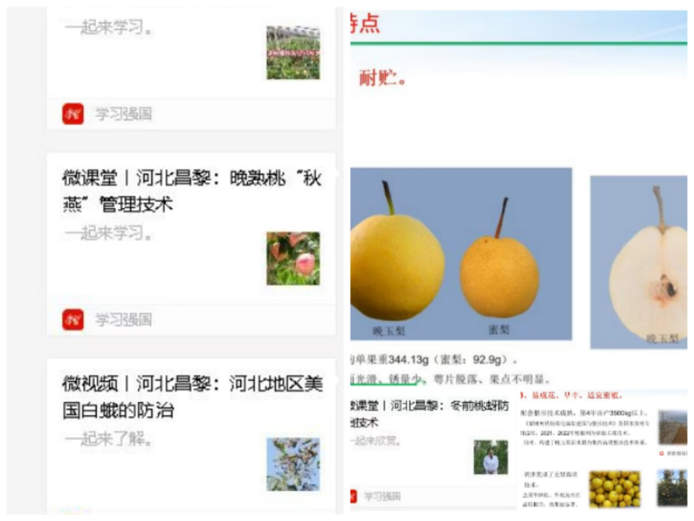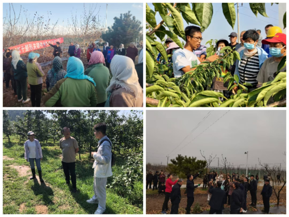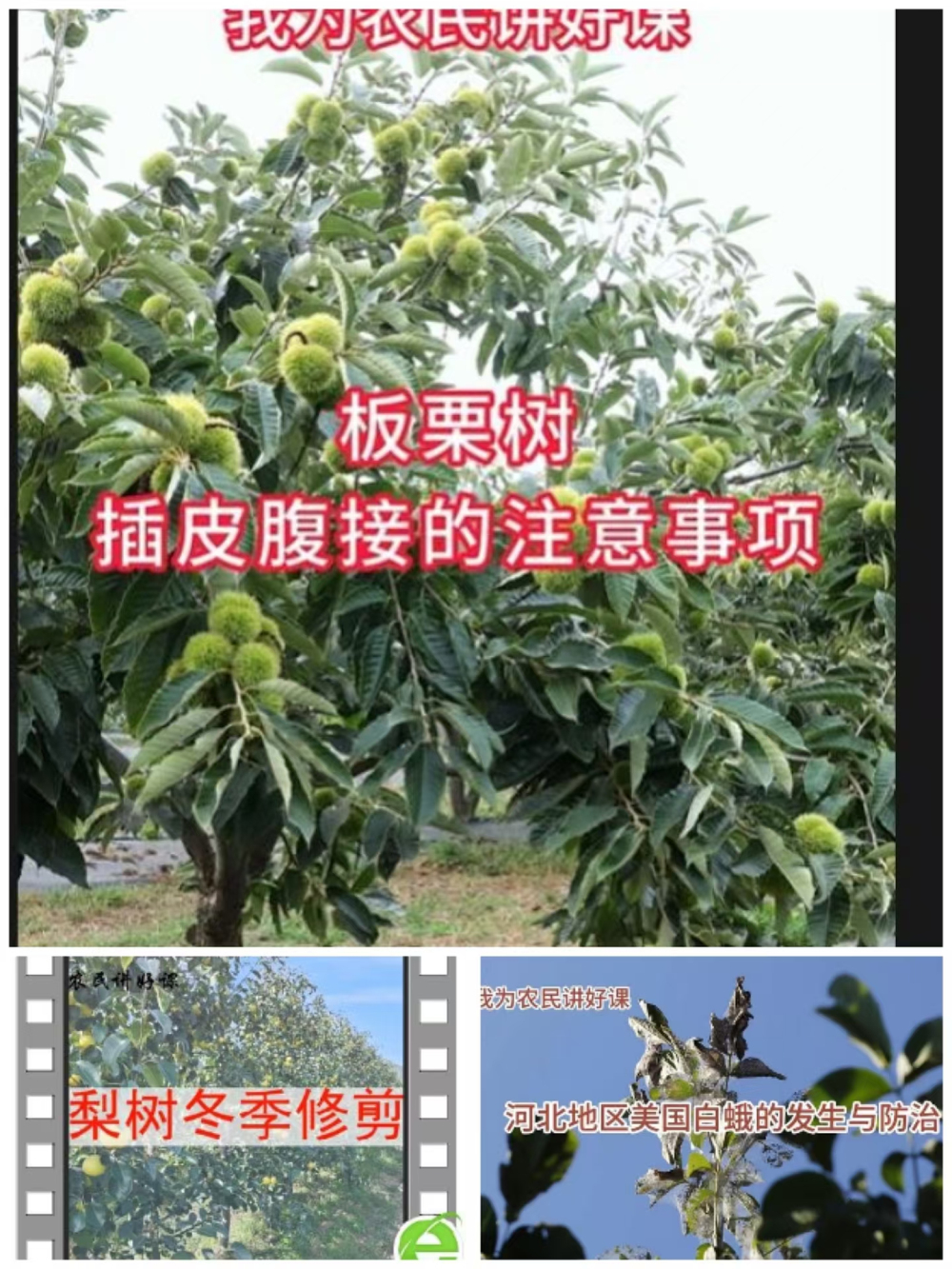 线下,苹果、梨、葡萄、桃、板栗、樱桃、核桃、植保八个研究室共计8名科技人员通过深入到田间地头真抓实干,详细讲解果树病虫害发生的原因与绿色防控方法、行间生草、土肥水管理、整形修剪等技术要点,手把手示范修剪技术,互动交流,现场把脉问诊,提高了农业生产科技服务水平;线上,八个研究室共计12名科技人员通过拍摄短视频的形式为农民详细讲解了苹果采收后果园管理技术要点、冬前桃蚜防治技术、设施葡萄萌芽期管理技术要点等,拍摄的12部关于果树栽培管理技术的科普短视频被“学习强国”平台采用,累计播放量超过16000次,达到了锻炼、展示和宣传的效果。