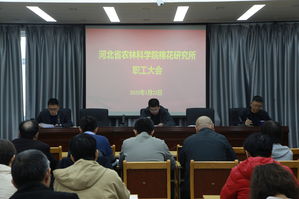 2025年1月22日上午,棉花所召开全所职工大会,传达贯彻全院工作会议精神,安排部署研究所2025年重点工作。会上,棉花所所长、党总支书记张建宏传达了院党组书记、院长张铁龙同志在全院工作会议上作的题为《深化体制机制改革 提升创新体系效能 为扎实推进乡村全面振兴提供有力科技支撑》的工作报告以及“科技人才队伍建设工作要点”专件;副所长祁虹传达了院重点任务工作“科技创新计划实施方案”和“科技示范与服务计划实施方案”专件,并宣读了2024年度优秀研究室和先进个人的表彰通报。