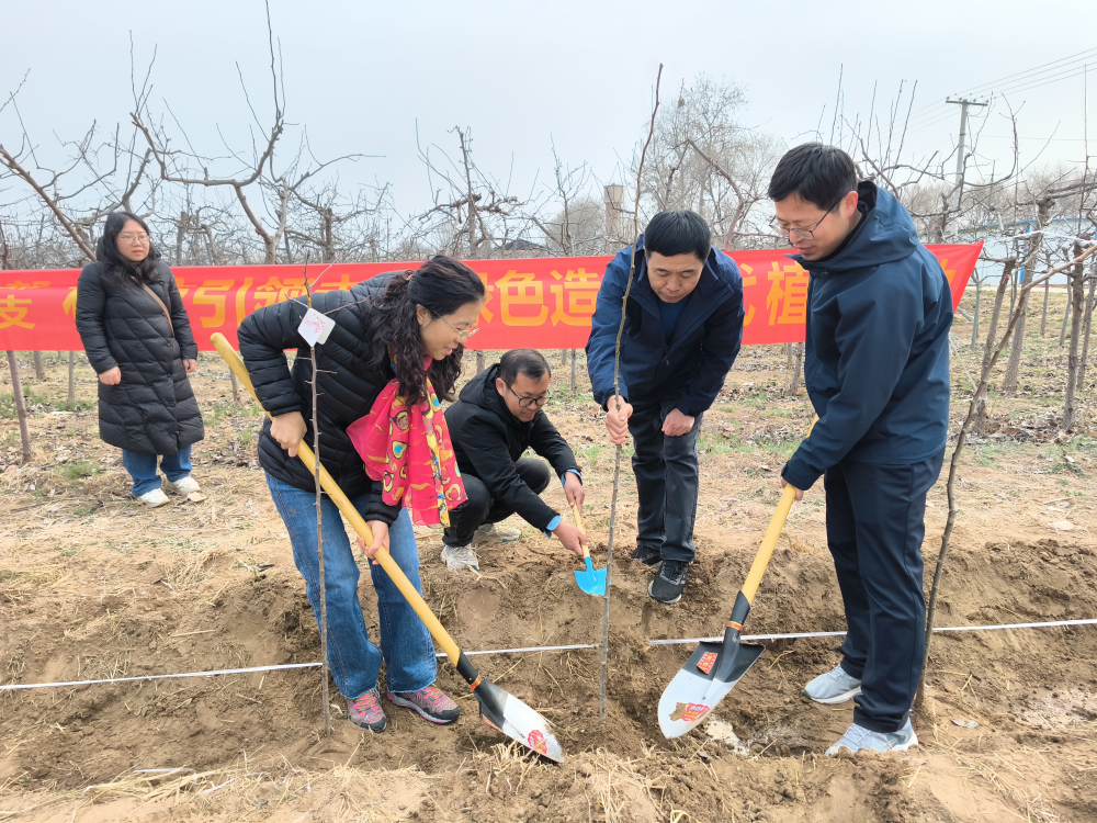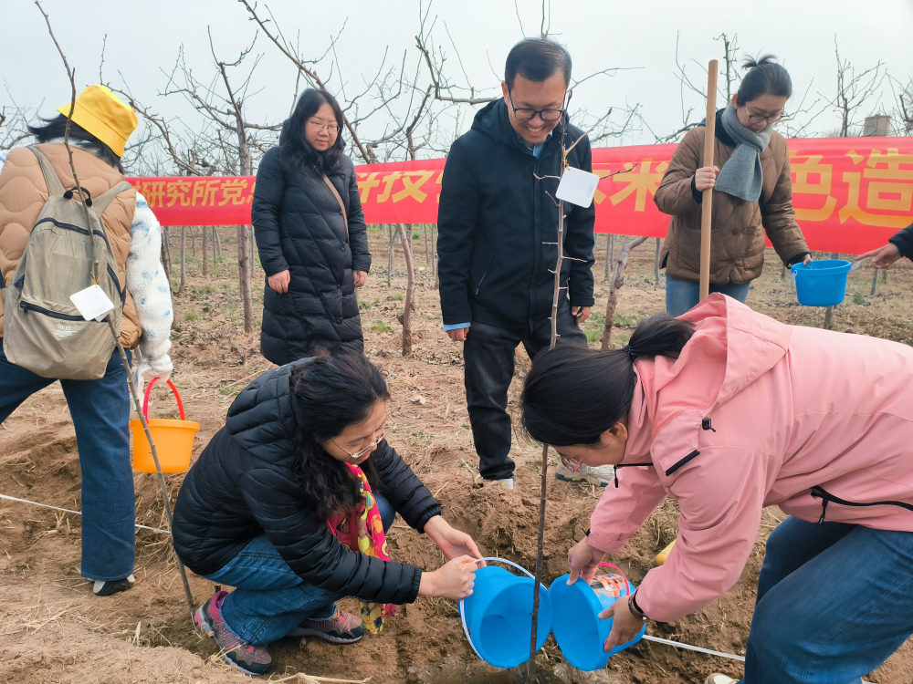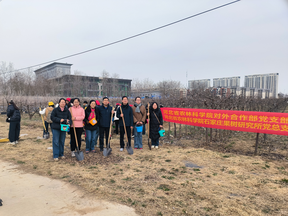 春风轻拂,大地回暖,2025年3月15日,石家庄果树研究所党总支与院对外合作部党支部在石家庄果树研究所梨试验地开展“科技引领未来 绿色造福后代”植树活动。亲手种下一棵树苗,培土、浇水,看着它在春风中扎根,是一次亲近自然的奇妙体验,更是一次责任与担当的践行。栽下的一棵棵小树苗,为大地增添了一抹新绿,为人类创造一个更清新的环境,为子孙后代留下一片美丽的家园。这次植树活动,地点选择在梨研究室试材地,树种为梨的杂交苗。支部成员在亲手体验植树的挖坑、培土、提苗、浇水细节中,与科技人员交流、了解果树知识。恰逢石家庄广播电视台组织的“用绿色播种未来 让城市听见童声”儿童城市实践活动开展,现场好不热闹。
