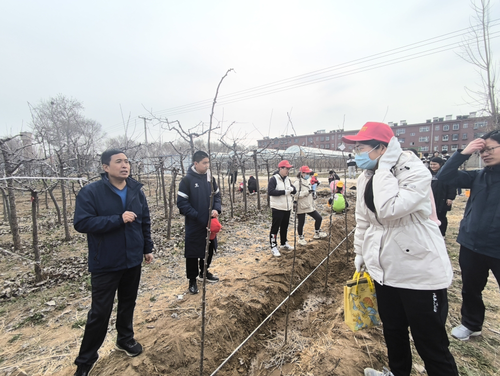 最后,25组亲子家庭到梨研究室试材地进行梨实生苗种植活动。梨研究室王晋博士详细讲解了梨苗的种植要点,并进行了实地操作。讲解完毕后,孩子们手持小铁锹和水桶,同家长们一起合力完成挖坑、栽种、填土、浇水等每一个步骤,并将写有自己名字的卡片挂在梨苗上。在整个种植过程中,王晋博士始终在一旁密切关注,随时提供专业的技术指导,耐心解答大家提出的各种疑问。活动现场一片欢声笑语,洋溢着温馨与幸福的气息。在亲手种植梨苗的过程中,孩子们不仅学到了实用的果树知识与技能,更深刻体会到了劳动的价值和大自然的神奇力量。